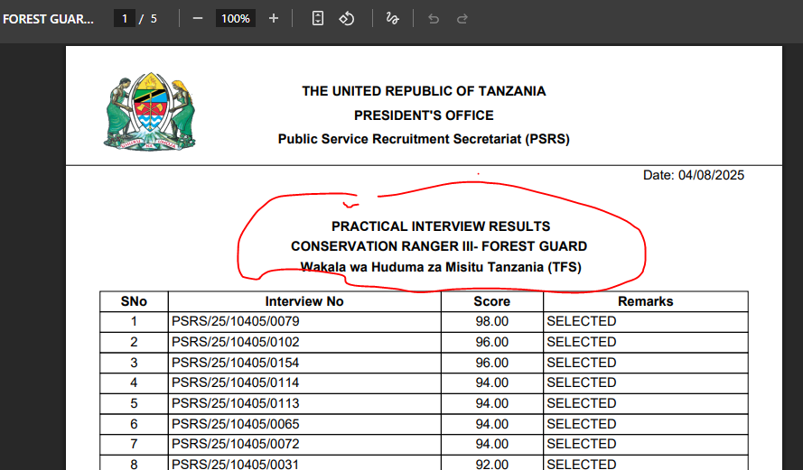 PRACTICAL INTERVIEW RESULTS CONSERVATION RANGER III- FOREST GUARD Wakala wa Huduma za Misitu Tanzania (TFS).