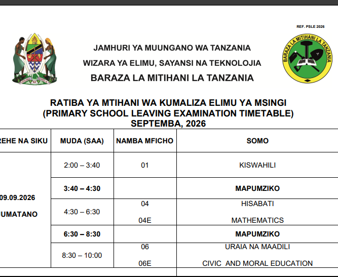 - Tafuta taarifa: PSLE 2026 Timetable