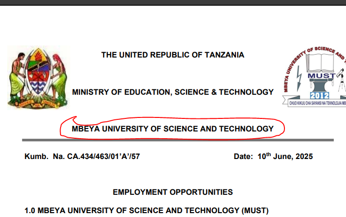 NAFASI ZA KAZI – CHUO KIKUU CHA SAYANSI NA TEKNOLOJIA MBEYA (MUST) – JUNI 2025