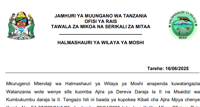 Nafasi Za Kazi Halmashauri Ya Wilaya Ya Moshi Juni, 2025