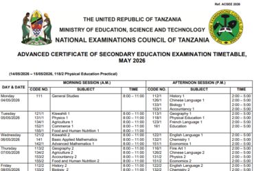 Ratiba ya mtihani kidato cha Sita 2026 ACSEE exam Timetable